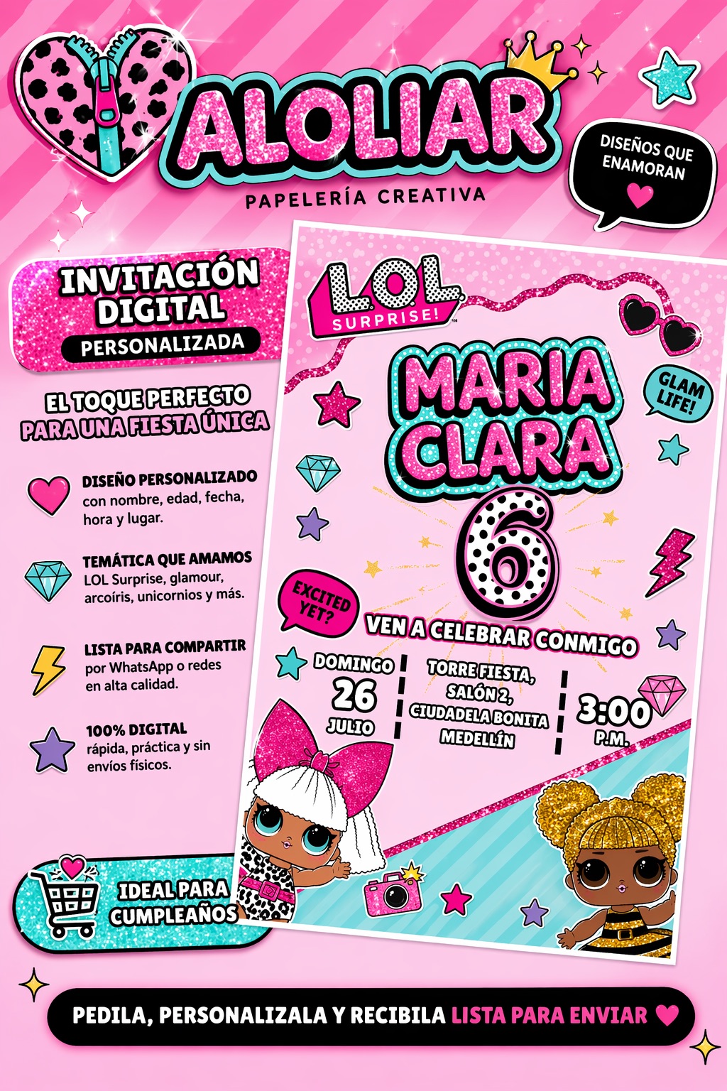 En Aloliar diseñamos tu invitación digital personalizada temática LOL Surprise con una estética alegre, femenina y encantadora, ideal para cumpleaños infantiles.